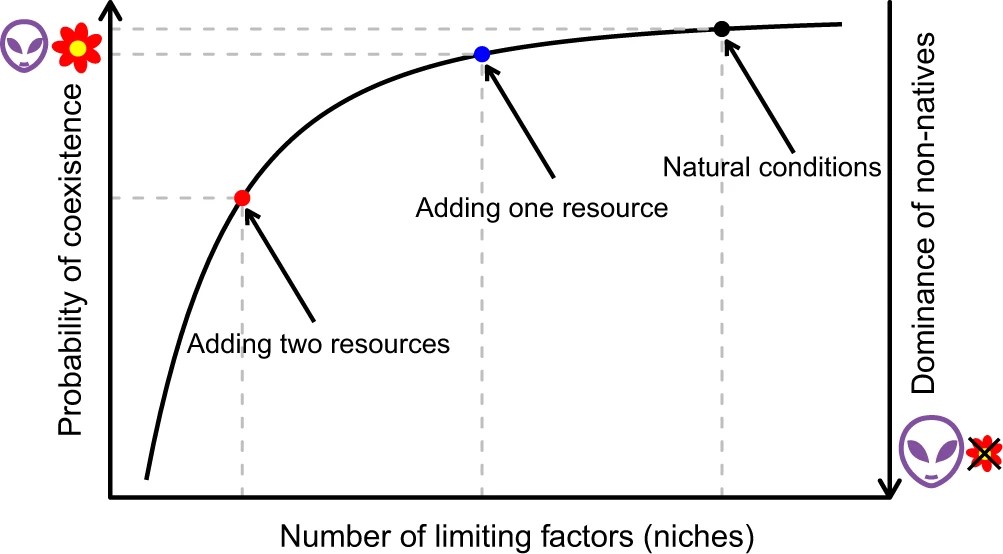 圖1 限制因素數量對物種共存和生物入侵影響的示意圖。自然條件下,限制因素(生態位)多,從而促進共存。資源添加會減少限制因素的數量,從而抑制共存,并促進外來物種的入侵。