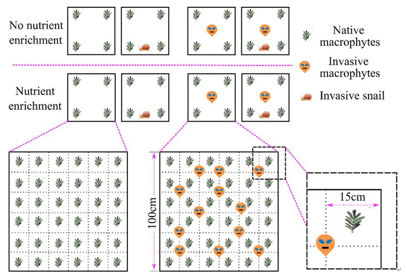針對(duì)以上研究空白,中科院東北地理所生物入侵生態(tài)學(xué)團(tuán)隊(duì)與中科院亞熱帶所洞庭湖站研究人員共同合作實(shí)施了一個(gè)中宇宙實(shí)驗(yàn),探究水體富營養(yǎng)化如何影響外來動(dòng)物福壽螺與外來水生植物粉綠狐尾藻的共同入侵以及三者如何交互影響本地植物群落。實(shí)驗(yàn)設(shè)計(jì)如圖1所示:對(duì)由三種水生植物組成的本地群落分別施加入侵動(dòng)物福壽螺(有采食vs無采食)、入侵植物粉綠狐尾藻(有植物入侵vs無植物入侵)和養(yǎng)分富集(是與否)的全因子處理。