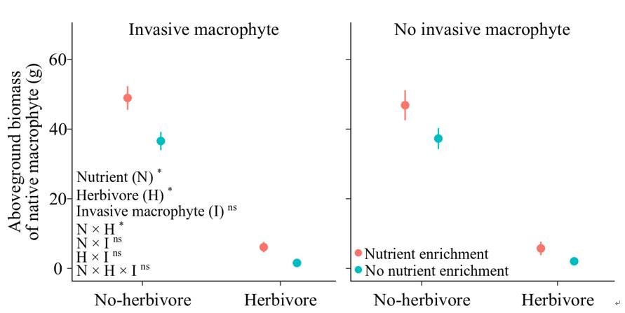 (1)富營養(yǎng)化顯著增加了本地植物群落的地上生物量,但不影響入侵植物粉綠狐尾藻的地上生物量(圖2)。因此,養(yǎng)分富集降低了群落中入侵植物粉綠狐尾藻的生物量占比(圖3b)。