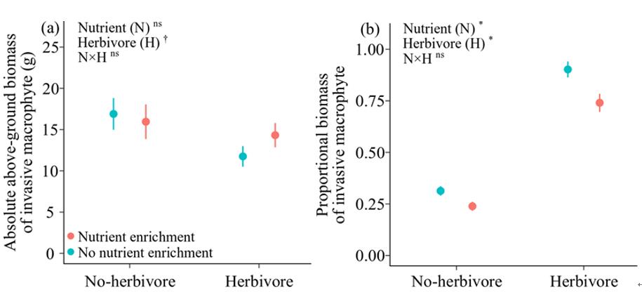 人類活動(dòng)和全球氣候變化的加劇導(dǎo)致許多生態(tài)系統(tǒng)經(jīng)歷著外來植物與外來動(dòng)物的同時(shí)入侵。 “入侵崩潰假說”(Invasional meltdown hypothesis)認(rèn)為,多種外來生物在入侵同一生態(tài)系統(tǒng)時(shí)會(huì)相互促進(jìn)彼此的入侵進(jìn)程,加劇對(duì)本地群落的負(fù)面影響。盡管該假說得到了許多實(shí)證研究的支持,但對(duì)于水生生態(tài)系統(tǒng)中來自同一產(chǎn)地的外來植物與外來植食性動(dòng)物的協(xié)同入侵機(jī)制仍缺乏足夠關(guān)注。因協(xié)同進(jìn)化歷史的差異,外來植食性動(dòng)物對(duì)與其同一原產(chǎn)地的外來植物產(chǎn)生的負(fù)面影響要弱于對(duì)本地植物產(chǎn)生的負(fù)面影響。因此,似然競(jìng)爭(Apparent competition)可能會(huì)調(diào)控兩者的協(xié)同入侵過程。另外,除生物入侵外,水體富營養(yǎng)化也成為威脅淡水生態(tài)系統(tǒng)健康的重要環(huán)境問題,其是否會(huì)與生物入侵互作影響本地群落也有待明確。