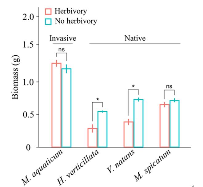 圖4福壽螺取食對(duì)外來植物(粉綠狐尾藻)和本地植物(黑藻、苦草、穗狀狐尾藻)生物量的影響