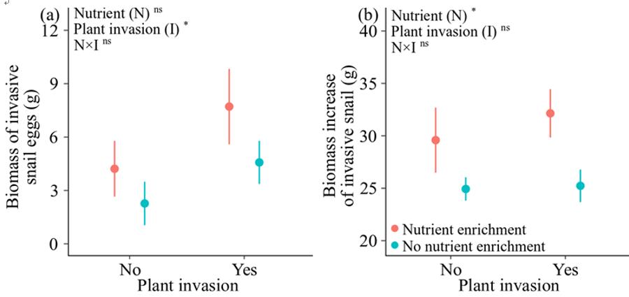 (4)福壽螺生長與繁殖的記錄數(shù)據(jù)表明,入侵植物粉綠狐尾藻的存在極大地提高了入侵動(dòng)物福壽螺的產(chǎn)卵量(圖5a);并且,富營養(yǎng)化導(dǎo)致入侵動(dòng)物福壽螺的生物量顯著增加(圖5b)。