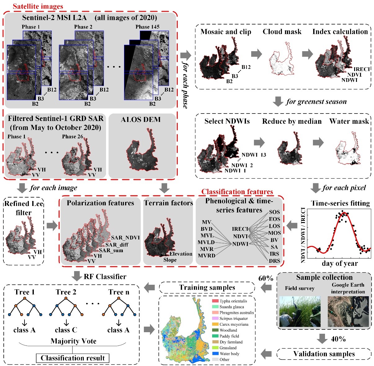 針對上述問題,東北地理所地理景觀遙感學科組的研究人員在Google Earth Engine遙感云平臺的支持下,采用密集時間序列Sentinel光學和雷達影像數據,研發了一種基于時間序列數據的隨機森林分類算法,并在莫莫格國際重要濕地實現了濕地植物群落的自動化和高精度分類,分類的一般流程如圖1所示。