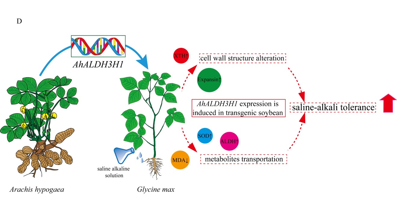 東北地理所農(nóng)田有害生物控制學(xué)科組孟凡立研究團(tuán)隊成員將來自于花生ALDH家族的AhALDH3H1基因成功轉(zhuǎn)入大豆受體中,發(fā)現(xiàn)在大豆基因組中過表達(dá)AhALDH3H1可以顯著增加轉(zhuǎn)基因大豆耐鹽堿能力(圖A-C)。轉(zhuǎn)錄組和代謝組分析表明,過表達(dá)AhALDH3H1一方面通過調(diào)控包括木葡聚糖內(nèi)轉(zhuǎn)糖苷酶水解酶(XTH)和擴(kuò)張蛋白(Expansin)在內(nèi)的細(xì)胞壁組成成分相關(guān)的重要基因,減少了鹽堿脅迫對轉(zhuǎn)基因大豆植株損害。另一方面,在抵御脅迫的過程中產(chǎn)生的SOD、MDA和ALDH,通過ABC transporter轉(zhuǎn)運途徑被成功轉(zhuǎn)運,維持細(xì)胞穩(wěn)態(tài)。本研究在大豆中過表達(dá)了花生的AhALDH3H1基因,獲得了耐蘇打鹽堿的轉(zhuǎn)基因大豆材料,明確了該基因過表達(dá)提高大豆耐鹽堿的機(jī)理,為大豆耐蘇打鹽堿育種提供理論依據(jù)及新的思路(圖D)。