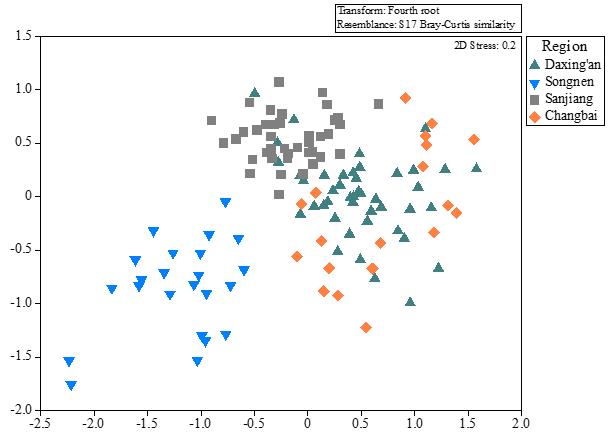 圖3 基于126處濕地螺類物種組成的非度量多維排序圖