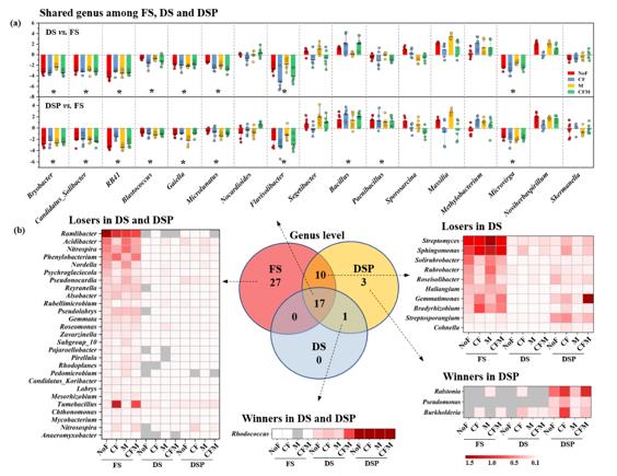 結果表明,長期干燥保存對土壤細菌多樣性和群落結構產生顯著影響,自然風干土壤中細菌群落多樣性是凍存土的46.8%,而去除relic DNA后的風干土壤細菌多樣性恢復了13.3%且明顯減小了與凍存土細菌群落結構的差異(圖1)。風干土壤保存了超過90%序列數的細菌門,但在屬水平上細菌對干燥壓力產生差異性應對策略(圖2)。盡管如此,土壤干燥保存沒有顯著改變長期施肥對土壤細菌多樣性、群落結構和群落抗性影響的遺留效應,即長期化肥添加顯著改變了細菌群落結構且降低了細菌群落多樣性。此外,土壤干燥保存減弱了細菌共線性網絡結構的穩(wěn)定性,但去除relic DNA后的風干土壤明顯恢復了微生物網絡特性。該研究提出了利用PMA核酸染料去除土壤中relic DNA的方法可改善長期干燥保存對土壤微生物群落的負面影響,同時施肥對土壤細菌的遺留效應在保存長達7年的風干土壤中仍可檢測到,表明長期保存的歷史土壤樣品或可用于不同農業(yè)管理下土壤微生物分子生態(tài)學研究。