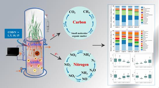 微生物燃料電池耦合人工濕地(MFC-CWs)被廣泛認為在污染物去除方面效果顯著,同時具有較好的產電性能,并被證明相較于傳統(tǒng)人工濕地可減少特定氣體(N2O、CH4和NH3)的排放。但目前關于C/N比對MFC-CWs污水處理效能、溫室氣體及NH3排放、生物產電性能的影響尚不明確,相關微生物學驅動機制也亟需探究。