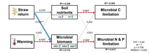 研究表明,短期增溫和秸稈還田除對土壤全氮含量具有顯著影響外,對其它基本土壤理化性質無顯著影響。秸稈還田顯著增加了土壤微生物生物量碳和細菌豐度(16S基因拷貝數),而增溫顯著降低了土壤微生物生物量碳和細菌豐度。秸稈還田顯著緩解了微生物磷限制,但增溫和秸稈還田耦合削弱了這一作用效果(圖1)。增溫和秸稈還田主要通過土壤養分含量變化影響微生物碳限制,通過影響微生物生物量進一步調控微生物氮磷限制(圖2)。研究結果闡明了增溫和秸稈還田耦合對土壤微生物養分限制的影響機制,進一步加深了對溫帶農田生態系統養分循環的認識。