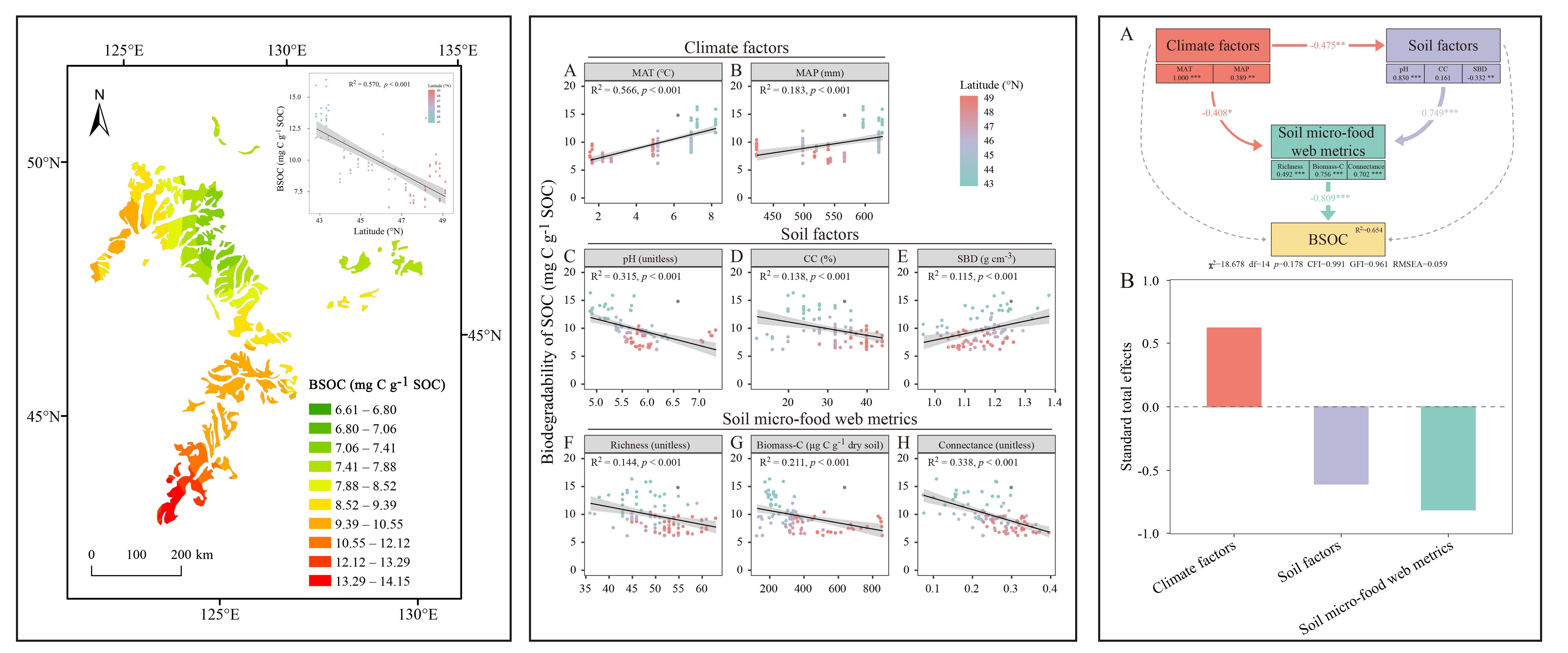 中國科學院東北地理與農(nóng)業(yè)生態(tài)研究所黑土有機碳與保護性耕作學科組科研人員以中國東北典型黑土區(qū)43°N-49°N緯度范圍內(nèi)的農(nóng)田土壤為研究對象,將土壤生物、氣候、土壤因子耦合起來,在區(qū)域尺度上深入揭示了農(nóng)田黑土有機碳生物降解性的緯度分布格局及其驅(qū)動機制。研究發(fā)現(xiàn)土壤有機碳生物降解性隨緯度增加呈現(xiàn)北低南高的分布格局,該變化趨勢主要受到隨緯度變化的土壤微食物網(wǎng)特性(豐富度、生物量碳和連通性)、氣候因子(年平均溫度和年平均降水)、土壤因子(土壤pH、土壤粘粒含量、土壤容重)的調(diào)控作用。通過結(jié)構(gòu)方程模型發(fā)現(xiàn),土壤微食物網(wǎng)特性是影響土壤有機碳生物降解性最直接且最重要的驅(qū)動因素。研究結(jié)果強調(diào)了土壤生物在調(diào)控農(nóng)田生態(tài)系統(tǒng)土壤有機碳礦化和固存中的重要作用。