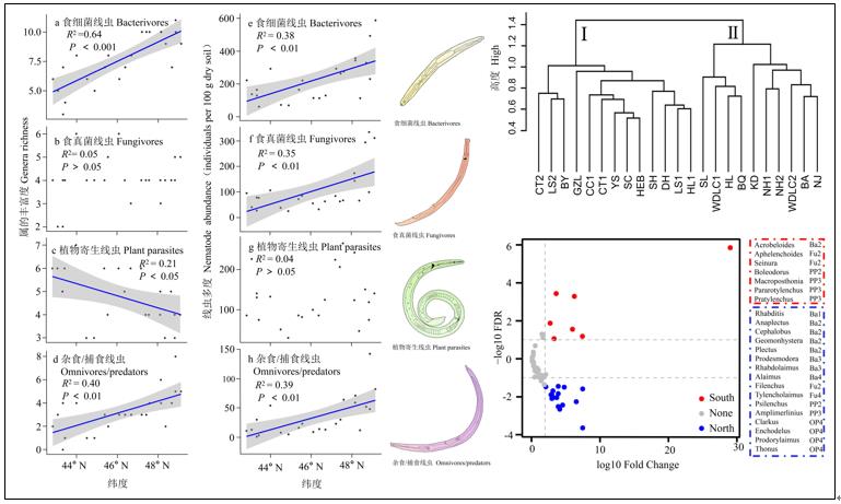 此外,利用形態(tài)學鑒定技術首次全面評估了土壤線蟲群落結(jié)構(gòu)在典型黑土區(qū)的緯度分布格局。研究發(fā)現(xiàn)土壤線蟲總豐富度和總多度的緯度分布格局與土壤有機碳生物降解性類似,均呈現(xiàn)均隨緯度增加而顯著增加的變化趨勢;并且線蟲群落以47°N為分界線可分為南部和北部兩類,土壤pH和土壤容重分別是影響南部與北部黑土區(qū)線蟲群落最重要的環(huán)境因子。