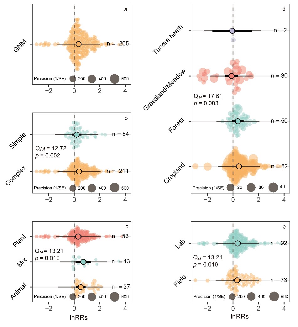 東北地理所土壤物質(zhì)循環(huán)學(xué)科組研究人員在Web of Science和中國知網(wǎng)上檢索了2021年9月10日前發(fā)表的相關(guān)文獻(xiàn),匯總了全球范圍內(nèi)63項(xiàng)研究的265組觀測值,借助分層模型和方差-協(xié)方差矩陣,進(jìn)行了土壤GNM對外源有機(jī)碳輸入響應(yīng)的meta分析,探討了外源有機(jī)碳性質(zhì)及環(huán)境因子對GNM的影響。