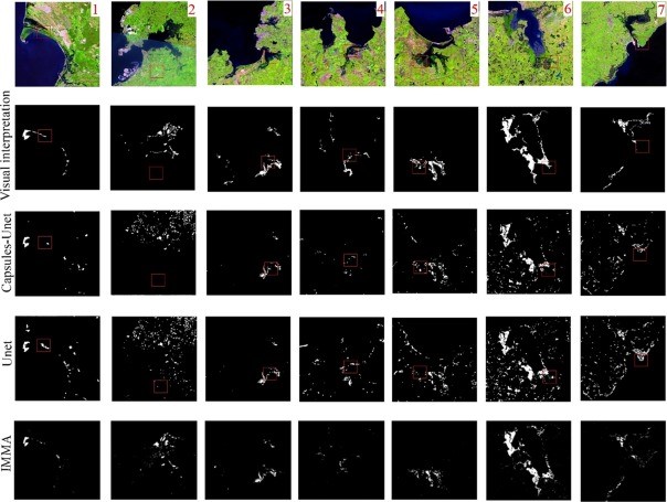 圖 紅樹林遙感識(shí)別方法IMMA與深度學(xué)習(xí)分類結(jié)果的比較。其中,目視解譯、Capsules-Unet、Unet結(jié)果均來(lái)自于Guo et al. (2021)。