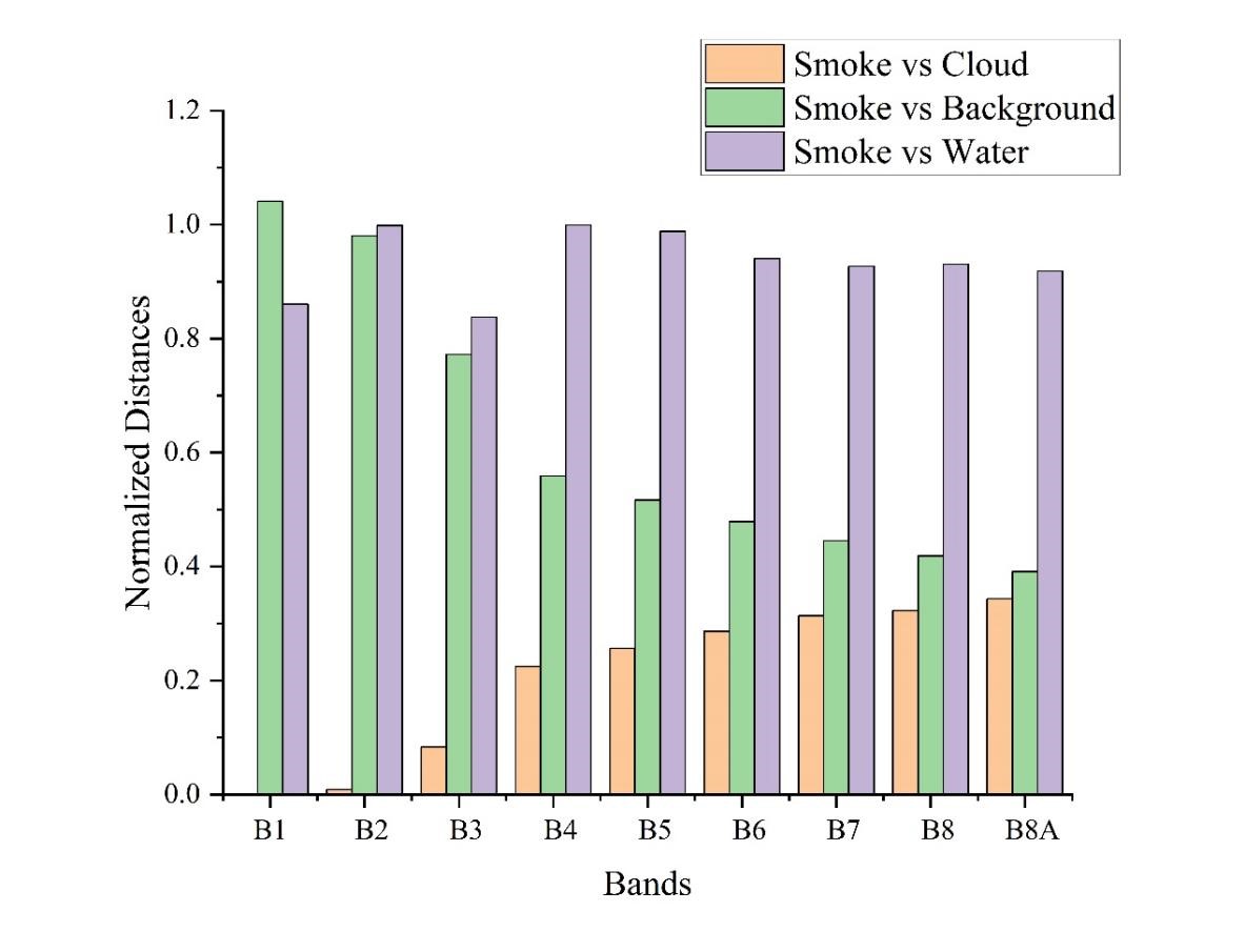 圖1 三對(duì)不同地物之間(煙羽對(duì)云、煙羽對(duì)背景、煙羽對(duì)水體)的可分離度
