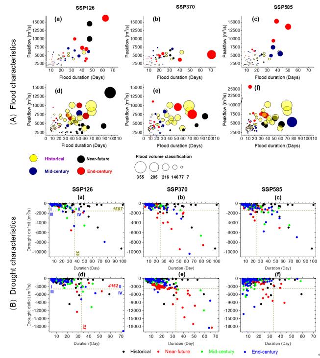 注:A:洪水持續(xù)時(shí)間-洪峰流量-洪量關(guān)系特征;B:干旱強(qiáng)度-持續(xù)時(shí)間關(guān)系。歷史時(shí)期(Historical):1971-2020年;近期(Near-future):2026-2050;本世紀(jì)中葉(Mid-century):2051-2075;本世紀(jì)末(End-century):2076-2100