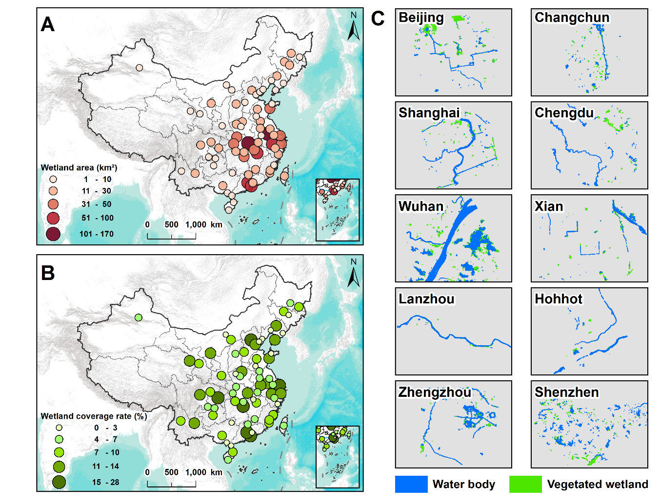 1985-2022年間,中國71個主要城市中有52個城市的城市濕地面積呈現出持續減少的趨勢,其中天津的減少幅度最大,減少了原有面積的 79.40%,其次是烏魯木齊(74.86%)和貴陽(67.55%)。有19個城市的城市濕地面積略有增加,其中呼和浩特的增幅最大(90.63%),其次是北海(89.21%)和西安(71.34%),雖然這些城市的城市濕地增長幅度較大,但由于其原有城市濕地體量較小,因此凈增長面積相對較小(小于3.88 km2)。從地表水體(Surface water)和有植被覆蓋的濕地(Vegetated wetland)兩種城市濕地類型來看,深圳和青島的地表水體在過去近40年損失最大(55.77km2和 33.54km2),南京和武漢的有植被覆蓋濕地損失最大(798.76km2和 75.14km2),哈爾濱和襄陽的地表水體面積、以及寧波和上海的有植被覆蓋濕地的面積均略有增加,但增幅較小。