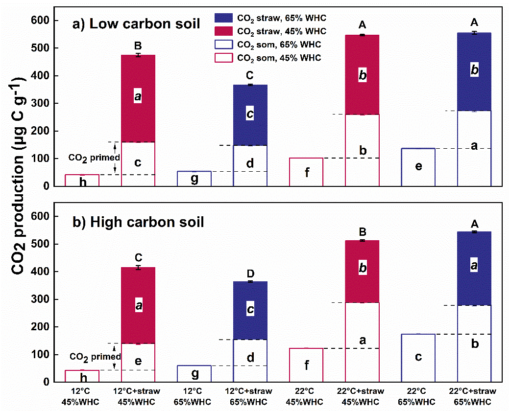 為此,東北地理所土壤物質(zhì)循環(huán)學科組李祿軍團隊研究人員以東北農(nóng)田黑土為研究對象,通過微宇宙控制實驗,利用13C穩(wěn)定同位素示蹤技術,深入探究土壤溫度(12°C和22°C)和濕度(45%WHC和65%WHC)及其耦合作用對土壤有機質(zhì)激發(fā)效應及其溫度敏感性的影響。