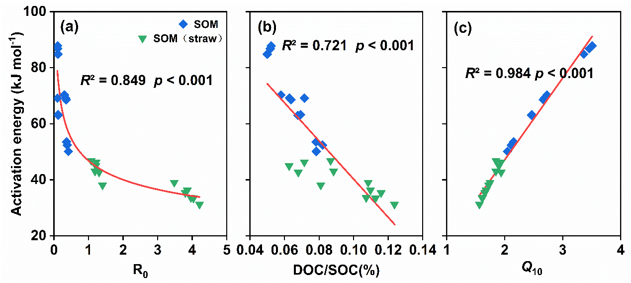 圖2 土壤有機質(zhì)礦化活化能與土壤碳質(zhì)量及溫度敏感性相關關系