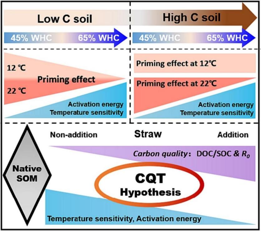 土壤有機質(zhì)(SOM)在農(nóng)田土壤肥力維持、碳封存和緩解氣候變化起著至關重要的作用,將作物殘留物還田被認為是維持和提升SOM的重要措施之一,然而,殘留物還田可能加速SOM的礦化,即為激發(fā)效應(PE),溫度敏感性(Q10)作為表征SOM礦化特性的重要參數(shù),很大程度上決定著陸地生態(tài)系統(tǒng)碳循環(huán)與氣候變暖之間反饋關系的方向與強度。影響SOM礦化過程的因素既包括生物因素,如土壤微生物和植物等,也包括非生物因素,如土壤水分和溫度等。盡管大量研究對SOM礦化過程及其驅(qū)動機制開展了深入探討,但是在外源有機物輸入條件下,多因素耦合影響下如何影響SOM礦化過程尚不明確。