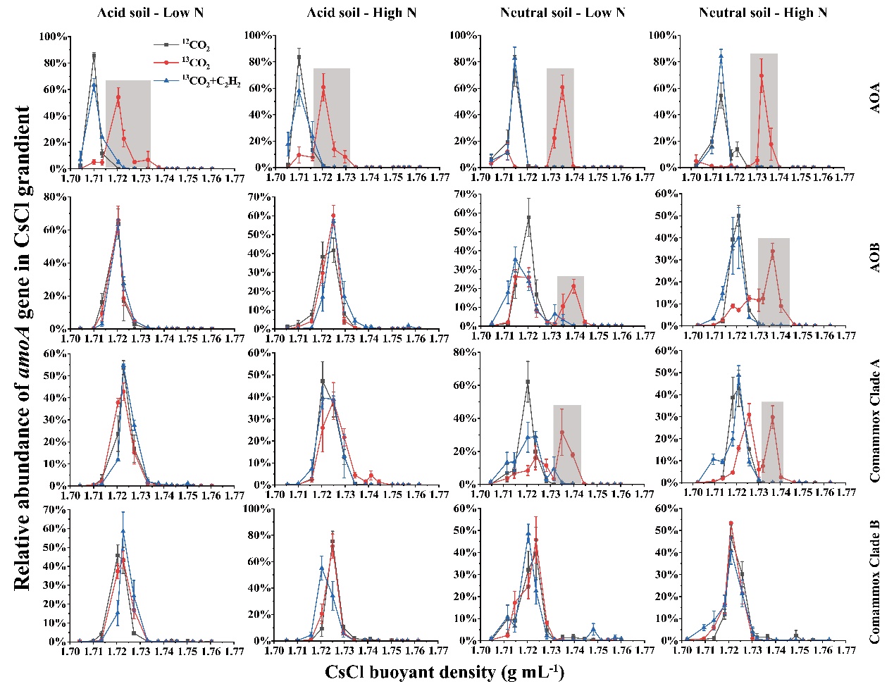 圖1 微宇宙培養(yǎng)后,AOA、AOB、comammox Clade A和comammox Clade B amoA基因拷貝數(shù)在浮力密度梯度上的定量分布