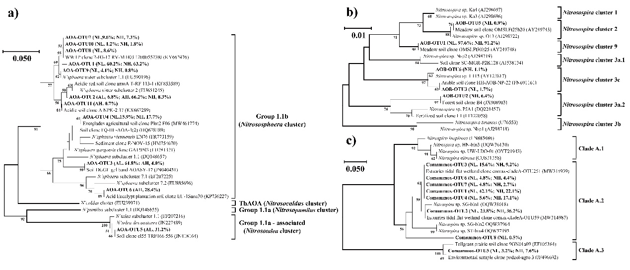 圖2 基于amoA基因13C標記的重層DNA中AOA(a)、AOB(b)和comammox Clade A(c)的氨基酸序列構建的系統(tǒng)發(fā)育樹
