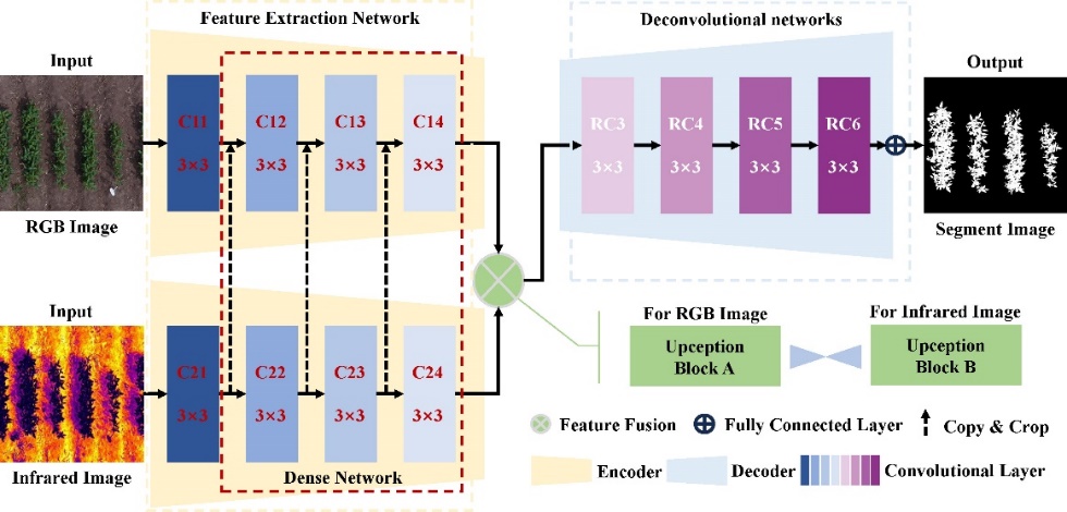 近日,中國科學(xué)院東北地理與農(nóng)業(yè)生態(tài)研究所馮獻忠團隊從中國東北地區(qū)收集了200份代表性大豆品種,并利用無人機飛行系統(tǒng)采集了表型數(shù)據(jù)。為了克服高通量表型研究中遇到的挑戰(zhàn),設(shè)計了一個專門用于大豆田間冠層分割的多模態(tài)深度學(xué)習(xí)模型——RIFSeg-Net,并利用紅外信息提高無人機拍攝的RGB圖像中大豆冠層的分割精度。通過動態(tài)建模,利用時間序列無人機圖像數(shù)據(jù)提取并構(gòu)建了與冠層發(fā)育動態(tài)相關(guān)的五個表型參數(shù)。該方法展示了典型的無人機高通量表型解21析過程,提出了對大豆生長模式和動態(tài)監(jiān)測的見解,并成功應(yīng)用于田間大規(guī)模種質(zhì)資源鑒定,為培育高產(chǎn)大豆品種提供了強有力的工具。