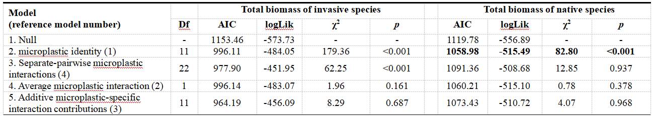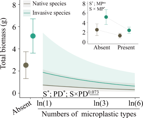 ????此外,通過hierarchical diversity-interaction 模型發(fā)現(xiàn),微塑料多樣性對外來入侵植物總生物量的負(fù)面影響既受微塑料性質(zhì)的影響,也受某些類型微塑料的影響,兩者之間存在強(qiáng)烈的配對相互作用。相比之下,對本地植物的影響則完全取決于微塑料性質(zhì)(表1)。