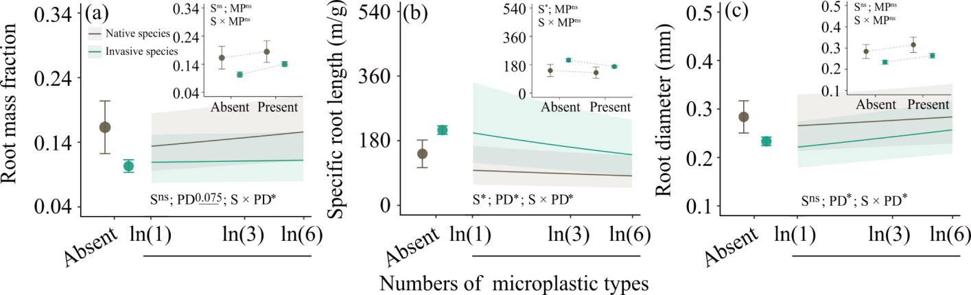????結(jié)果表明:隨土壤中微塑料多樣性增加,微塑料污染對植物生長的抑制作用逐漸增強(qiáng),且微塑料多樣性對外來入侵植物的負(fù)面影響強(qiáng)于本地植物(圖2),這可能與根系分配和根系厚度的變化不同有關(guān)(圖3);并且,與本地植物不同,無論土壤中是否存在微塑料污染,外來入侵植物都會比本地植物產(chǎn)生更多生物量。