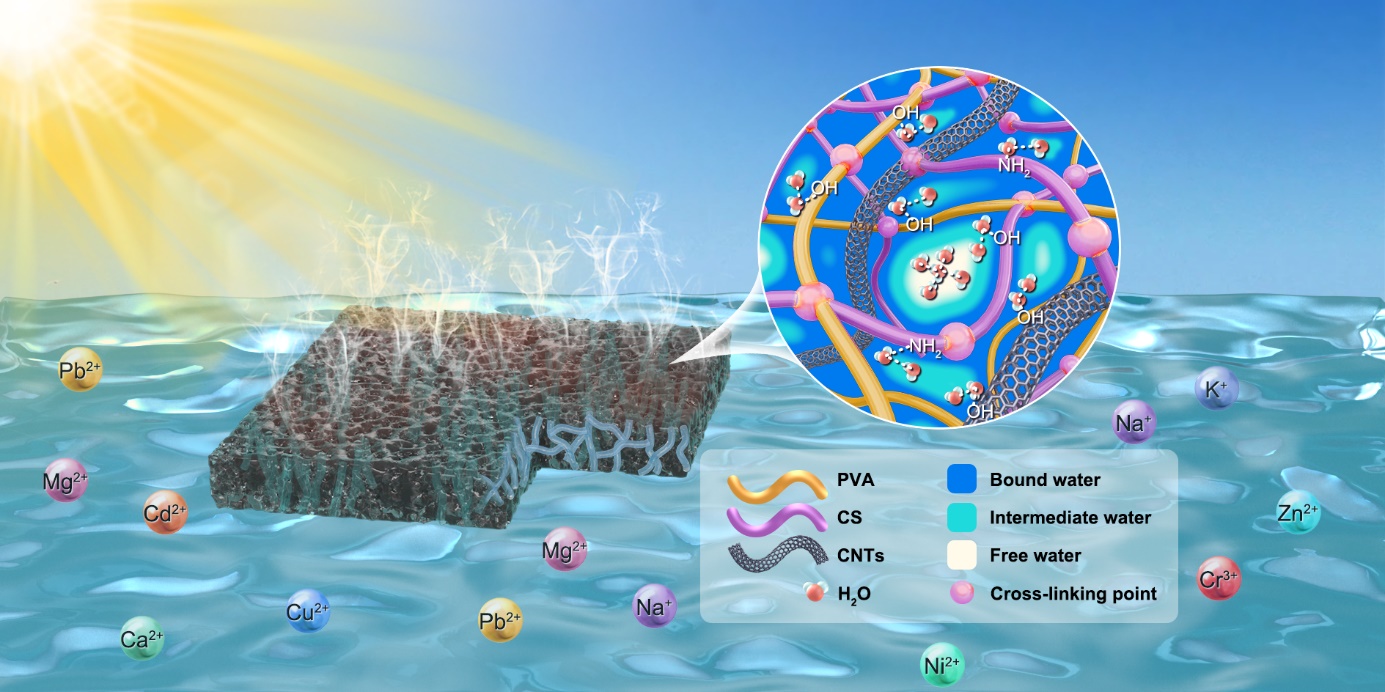 東北地理所水環境污染與防治研究團隊通過多策略耦合開發了一種基于超親水互連多孔水凝膠(SIPH)的太陽能蒸發器(圖1)。該研究采用原位共凝膠法,將氧化碳納米管(CNTs)作為太陽能吸收劑,摻雜到由聚乙烯醇(PVA)和殼聚糖(CS)交聯形成的混合聚合物網絡中合成,制備出SIPH。SIPH中的超親水互連多孔結構不僅促進了水傳輸,而且增強了光吸收。利用?NH2調節聚合物網絡-水的相互作用產生了高比例的活性水,將蒸發焓降低到純水的三分之一。此外,混合聚合物網絡的形成顯著降低了蒸汽生成過程中水的對流熱損失,賦予SIPH杰出的熱定位效應。基于這種多策略耦合設計,SIPH在一個模擬陽光下實現了4.80kgm-2h-1的高蒸發率和95.0%的能源效率。在凈化效能方面(圖2),通過對收集的冷凝水分析發現基于SIPH的太陽能水凈化技術對于海水主要離子去除率均超過99.996%,對工業廢水中6種高濃度金屬離子去除率均達到99.999%,凈化后蘇打鹽堿水中的主要陰離子濃度也遠低于中國和WHO規定的飲用水標準限值。此外,SIPH在不同水質中均保持了穩定的蒸發速率和優異的抗污染性能。
