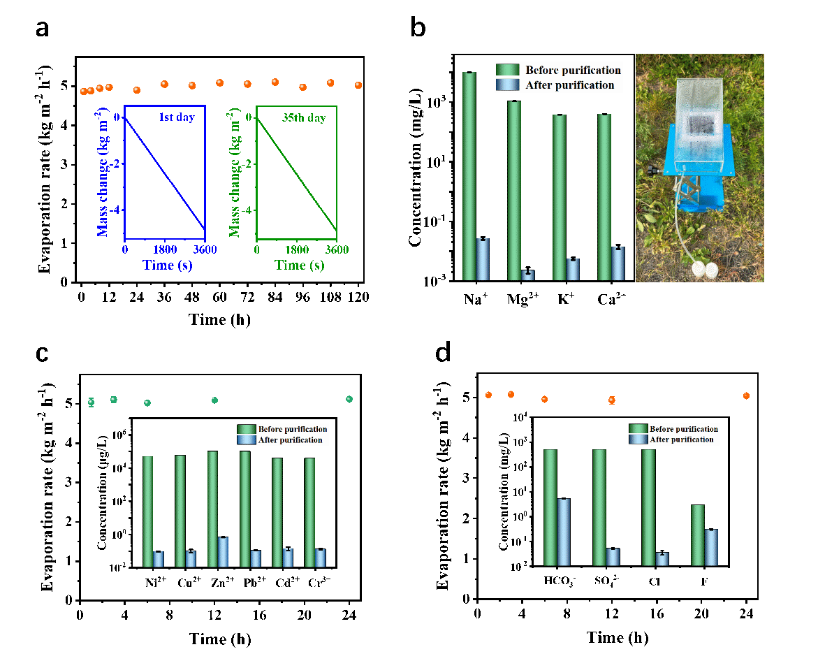 圖2. (a)SIPH5在天然海水中連續太陽能脫鹽120小時的耐久性測試?插圖:太陽能脫鹽實驗中SIPH5在海水中最初1小時和在海水中浸泡30天后1小時內的質量變化?(b)凈化前后天然海水中主要離子濃度和室外太陽能凈水系統,該系統在本實驗中用于海水淡化、工業廢水和蘇打鹽堿水的凈化?(c, d) SIPH5在工業廢水(c)和蘇打鹽堿水(d)中的穩定性和凈化能力評估