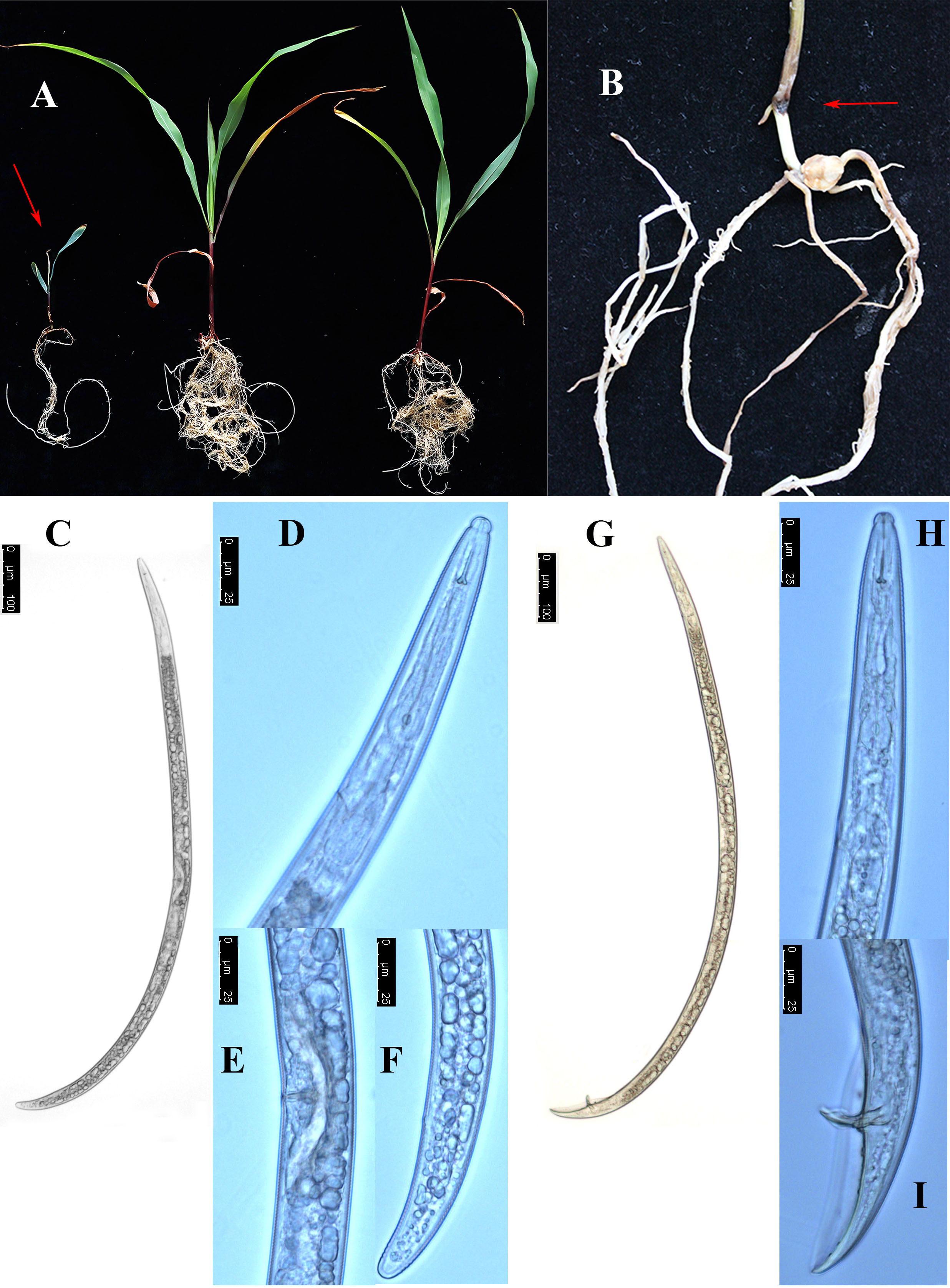 圖2長嶺發(fā)墊刃線蟲Trichotylenchus changlingensis形態(tài)及對玉米危害特征
