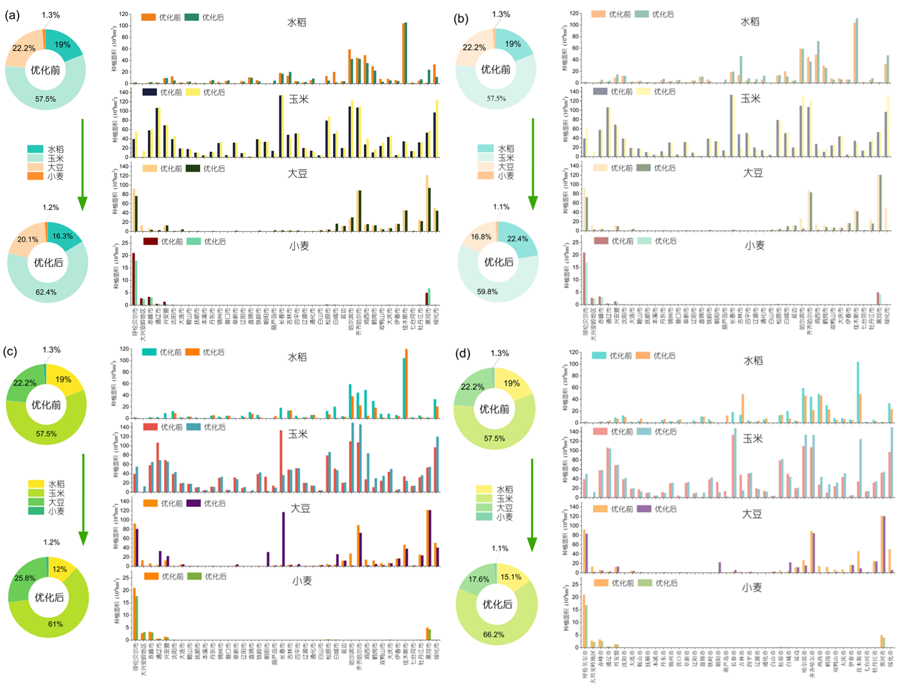 圖3 優(yōu)化前后東北黑土區(qū)作物種植結(jié)構(gòu)對比分析(a)平水年常規(guī)灌溉情景(b)平水年節(jié)水灌溉情景(c)枯水年常規(guī)灌溉情景(d)枯水年節(jié)水灌溉情景