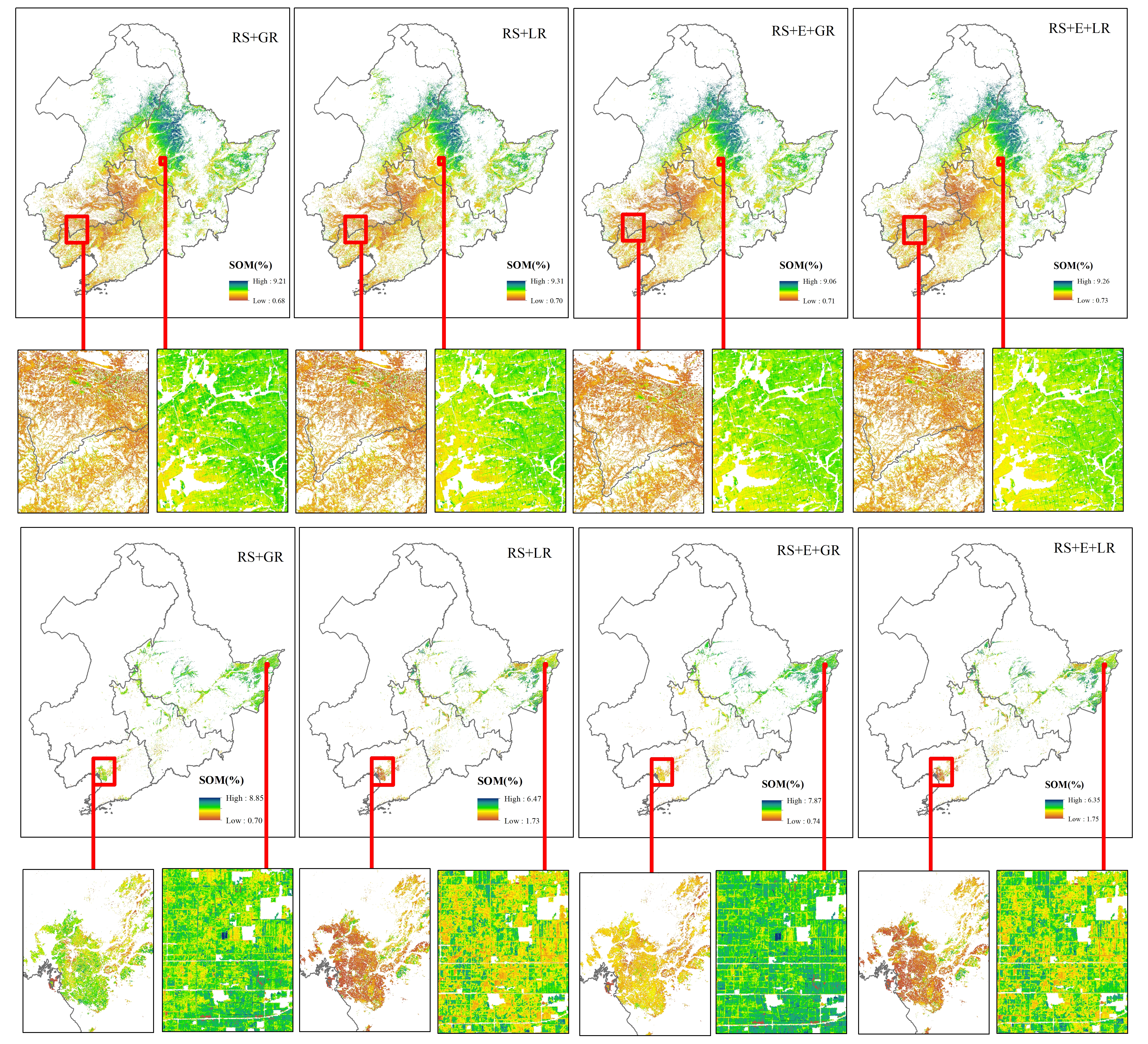 圖1. 采用不同策略進(jìn)行土壤有機(jī)質(zhì)制圖結(jié)果