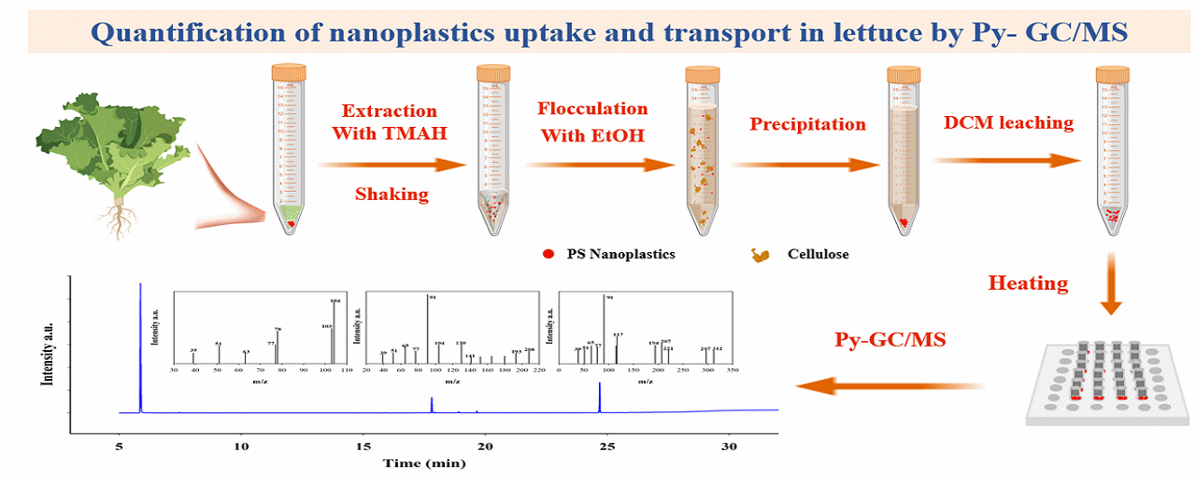 在日益嚴(yán)峻的環(huán)境污染挑戰(zhàn)中,微塑料(MPs)與納米塑料(NPs)作為新污染物,已廣泛分布于自然環(huán)境中,威脅著陸地生態(tài)系統(tǒng)健康。環(huán)境中的NPs質(zhì)量較低,難以精確檢測,其環(huán)境風(fēng)險評估一直面臨技術(shù)瓶頸。東北地理所環(huán)境生態(tài)學(xué)科組研究團隊通過優(yōu)化提取程序和儀器的熱裂解溫度,成功開發(fā)出一種基于熱裂解氣相色譜質(zhì)譜(Py-GC/MS)鑒定和定量植物中納米塑料的方法,有效解決了這一問題[1]。該方法具有高度靈敏、操作簡便的優(yōu)點,并且避免了金屬標(biāo)記元素對植物的干擾。已成功將該方法應(yīng)用于生菜對納米塑料吸收情況的量化研究。