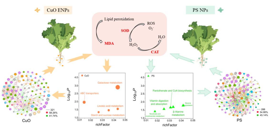 在建立分析方法的基礎(chǔ)上,該團隊對比并揭示了NPs和工程納米顆粒物(ENPs)對生菜的差異作用機制[2]。研究發(fā)現(xiàn),暴露于NPs和ENPs的生菜中,氧化銅(CuO)ENPs引起的生菜膜損傷最為嚴(yán)重,根系通過上調(diào)半乳糖代謝和改變亞油酸代謝對CuO做出響應(yīng),而暴露于NPs的根系通過調(diào)節(jié)氨基酸、輔因子和維生素代謝應(yīng)對NPs脅迫。這些代謝途徑的改變進一步調(diào)節(jié)了CuO和NPs對根際微生物的不利影響。