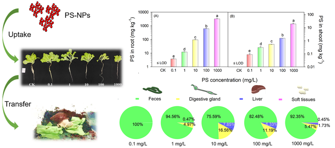 此外,該團隊進一步評估了NPs在食物鏈中的傳遞風(fēng)險,首次基于質(zhì)量濃度量化了NPs在生菜-蝸牛食物鏈中的營養(yǎng)轉(zhuǎn)移[3]。結(jié)果發(fā)現(xiàn),NPs的暴露濃度影響其在生物體內(nèi)的營養(yǎng)轉(zhuǎn)移和生物分布,對直接暴露的生菜和間接暴露的蝸牛產(chǎn)生了不同程度的影響。