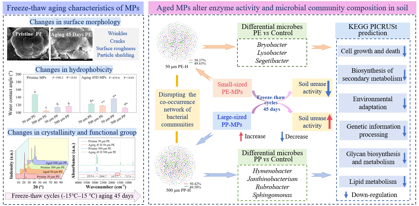 針對寒冷地區(qū)特有的凍融(FT)循環(huán)現(xiàn)象,該研究團隊進一步探索了FT老化后的MPs對土壤酶活性和微生物群落結(jié)構(gòu)的影響[4]。研究結(jié)果表明,FT老化后的MPs表面形貌和疏水性改變,結(jié)晶度降低。小粒徑的MPs抑制了土壤脲酶的活性,而大粒徑的MPs提高了土壤脲酶活性。FT老化的MPs顯著改變了土壤微生物的群落結(jié)構(gòu),增加了細(xì)菌群落共現(xiàn)網(wǎng)絡(luò)的復(fù)雜性。FT老化后的MPs還會影響遺傳信息和細(xì)胞過程,并破壞次級代謝產(chǎn)物的生物合成。