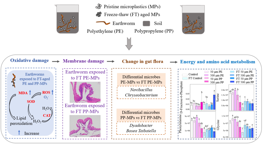 與此同時,該團隊還揭示了FT老化的MPs對蚯蚓的毒性作用機制[5]。結(jié)果發(fā)現(xiàn),FT老化的聚丙烯(PP)MPs比原始PP-MPs對蚯蚓造成更嚴(yán)重的氧化應(yīng)激和膜損傷。FT老化的MPs會導(dǎo)致蚯蚓腸道菌群失衡并富集具有塑料降解能力的微生物屬。與原始的聚乙烯(PE)MPs和PP-MPs相比,FT老化的PE-MPs通過上調(diào)脂質(zhì)和類脂分子來影響膜轉(zhuǎn)運,而FT老化的PP-MPs通過下調(diào)有機雜環(huán)化合物來改變外源物質(zhì)的生物降解和代謝。
