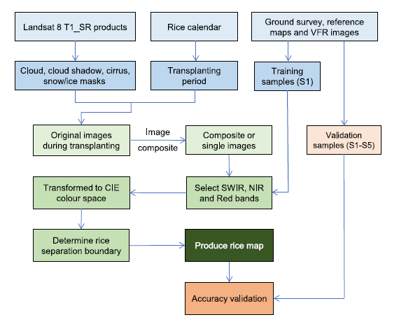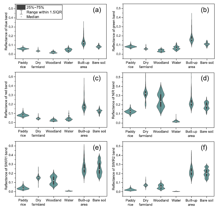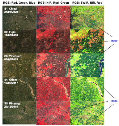 針對以上科學(xué)難題,中國科學(xué)院東北地理所李華朋副研究員帶領(lǐng)團隊,首次研發(fā)了一種全新的方法,命名為RiceTColour,旨在基于水稻在移栽期間的獨特光譜特征開展水稻遙感制圖。通過分析水稻和其他土地覆蓋在可見光、近紅外和短波紅外波段的光譜分布特征,首次發(fā)現(xiàn)水稻在移栽期近紅外和短波紅外反射率值低于其他地物類型(除水體)的獨特特征;進而,使用短波紅外、近紅外和紅色波段組合,水稻田在遙感影像上呈現(xiàn)獨特的顏色。