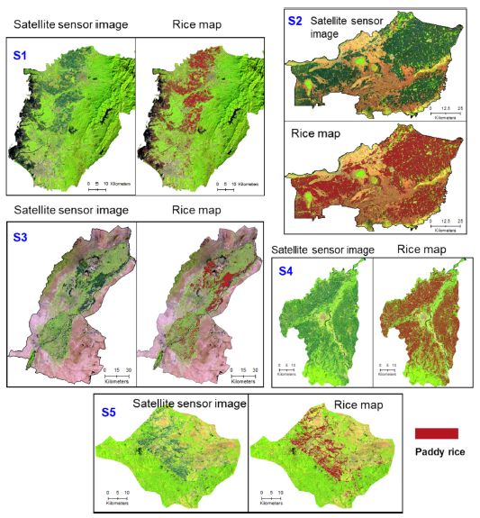 選擇了我國五個典型的水稻種植區(qū),在不同的環(huán)境條件下,全面測試所開發(fā)的RiceTColour水稻制圖方法的有效性和普遍性。這些區(qū)域在氣候、水稻種植強度、灌溉方式以及作物輪作等方面存在顯著差異。實驗結(jié)果表明,RiceTColour方法在所有五個地點相比基準方法始終取得了最準確和均衡的分類制圖結(jié)果。RiceTColour在訓(xùn)練地點(S1)中表現(xiàn)相對穩(wěn)定,整體制圖準確率超過95%,在四個測試地點(S2至S5)中也取得了令人鼓舞的精度(>95%)。在各個水稻種植區(qū)域高效且穩(wěn)定的水稻制圖結(jié)果表明,所提出的無參數(shù)且高效的RiceTColour方法具有強大的推廣能力。