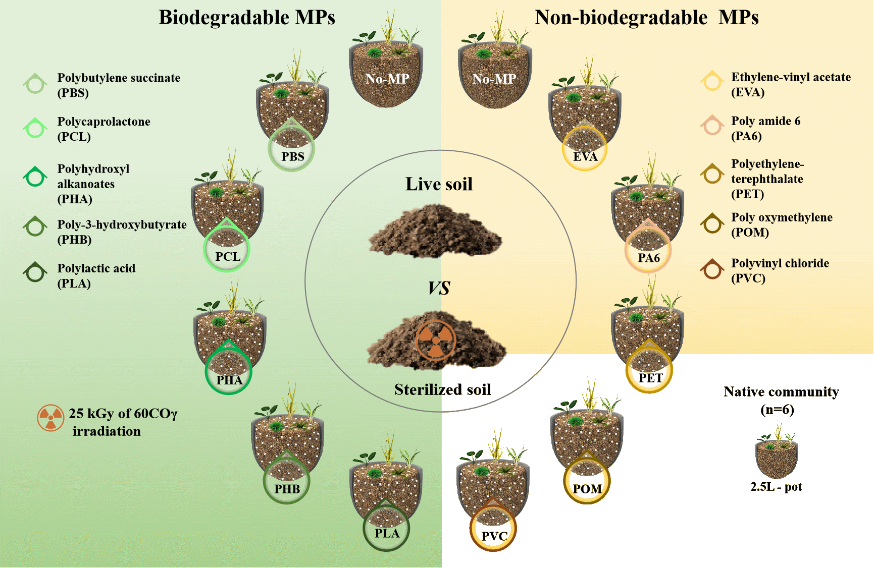 基于以上研究空白,中國科學(xué)院東北地理與農(nóng)業(yè)生態(tài)研究所生物入侵生態(tài)學(xué)研究團(tuán)隊(duì)設(shè)計(jì)了一個(gè)包含多種微塑料、多個(gè)本地植物群落的溫室盆栽實(shí)驗(yàn)(圖1)。實(shí)驗(yàn)設(shè)計(jì)如圖1所示:對由5種草地植物組成的本地群落分別進(jìn)行 11 微塑料(5可降解微塑料,5不可生物降解微塑料,1對照)和土壤滅菌(滅菌vs.不滅菌)的全因子處理。
