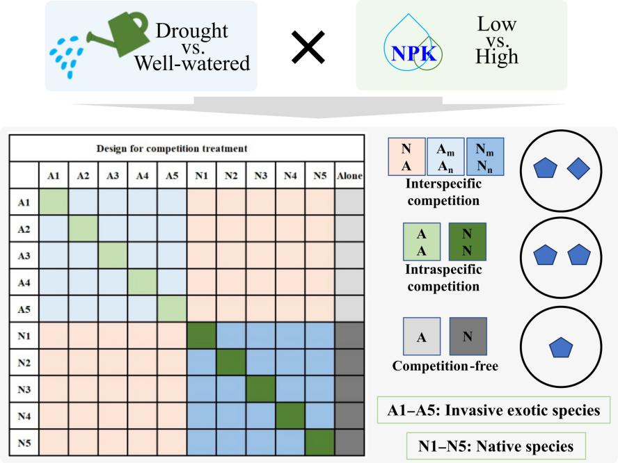 中國科學院東北地理與農業(yè)生態(tài)研究所的生物入侵生態(tài)學團隊通過溫室盆栽控制實驗,探討了多物種之間的相互作用機制,以解決上述科學問題(圖1)。實驗選取了5對入侵和本地植物物種作為研究對象,并設置了三種植物相互作用水平:(1)種內競爭,即目標植物與同種植物共同生長;(2)種間競爭,即目標植物與不同種的本地或入侵植物共同生長;(3)無競爭,即目標種單獨種植。這些植物間相互作用處理進一步與兩種土壤水分水平(干旱與充足水分)及兩種土壤養(yǎng)分水平(低養(yǎng)分與高養(yǎng)分)進行了全因子交互設置。