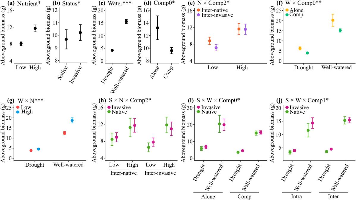 結果顯示,低養(yǎng)分條件下,與目標本地植物相比,目標入侵植物與其他入侵植物共同生長時獲得更大的地上生物量,而高養(yǎng)分條件下,目標入侵植物與其他入侵植物共同生長時表現(xiàn)較差(圖2h)。此外,低養(yǎng)分環(huán)境中,無論目標植物是否為入侵物種,本地競爭者促進目標植物的地上生物量(圖2e)。種間競爭中,干旱對本地目標植物生長的負面影響更顯著;而無論競爭類型如何,目標入侵植物與目標本地植物受干旱脅迫影響相似(圖2j)。