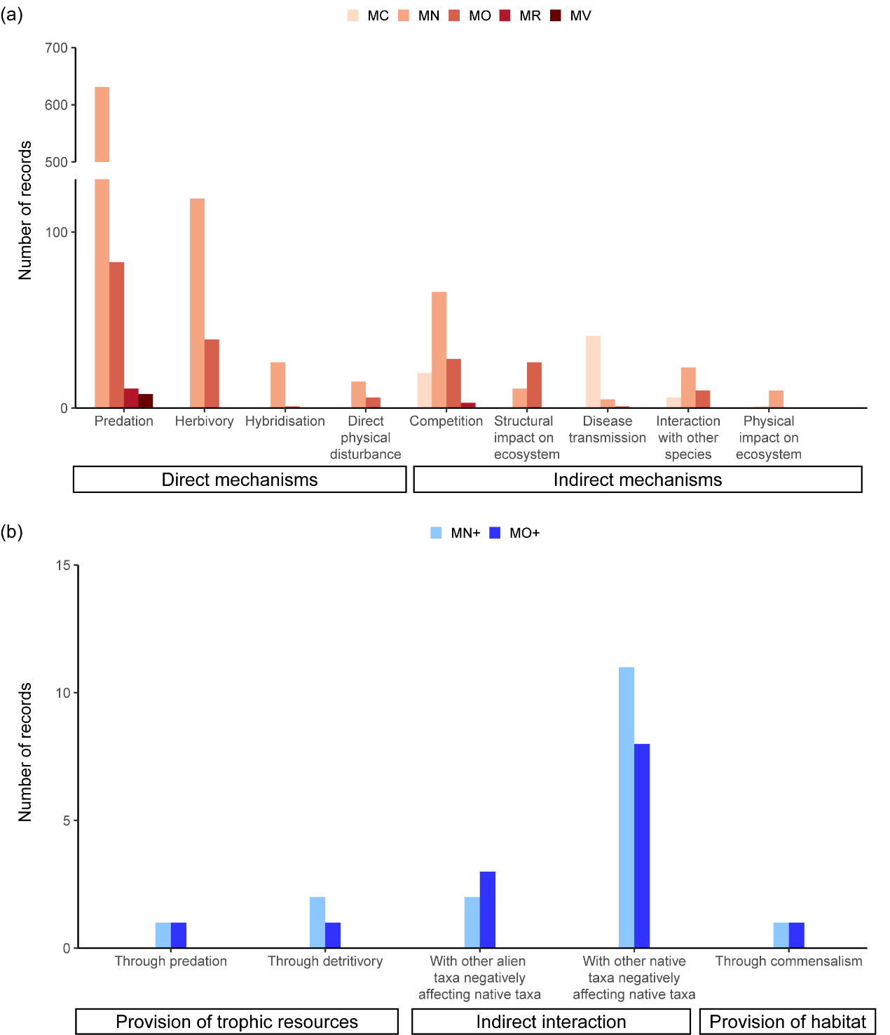圖4 基于EICAT和EICAT+框架評(píng)估的各外來淡水大型魚類物種對(duì)本土物種的影響機(jī)制。MC/ML+:無明顯影響;MN/MN+:個(gè)體適合度下降或增加;MO/MO+:種群數(shù)量減少或增加;MR:種群滅絕但該效應(yīng)在外來物種被清除后可逆;MV:種群永久性滅絕。