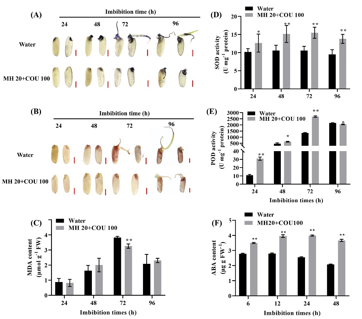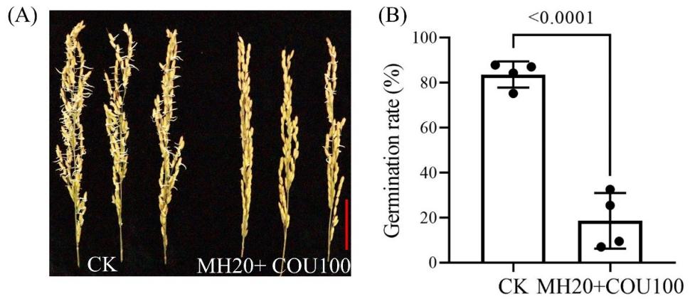 研究團隊通過連續(xù)和短期浸種實驗,從馬來酰肼(MH)、香豆素(COU)和丁香酚(EUG)三種穗發(fā)芽抑制劑中篩選出穗發(fā)芽抑制劑的最佳組合為MH 20 mg L-1 + COU 100 mg L-1,該組合可顯著降低水稻種子發(fā)芽率。進一步研究表明,該組合處理顯著降低了種子萌發(fā)過程中的α-淀粉酶活性,減少了可溶性糖和可溶性蛋白的含量,從而抑制了種子萌發(fā)所需的能量和物質(zhì)供應(yīng)。該組合還能調(diào)節(jié)抗氧化酶活性,抑制活性氧(ROS)的積累,減少MDA的產(chǎn)生;促進種子內(nèi)ABA含量快速積累(圖1)。基因表達(dá)分析表明,MH和COU組合通過調(diào)節(jié)OsNCED1/2/5和OsABA8ox1-3表達(dá),精準(zhǔn)調(diào)節(jié)水稻種子內(nèi)ABA的含量。在不同萌發(fā)階段,該組合對ROS產(chǎn)生基因OsRbohs表達(dá)的調(diào)節(jié)不同,還下調(diào)了α-淀粉酶基因(OsAmy1A和OsAmy3D)的表達(dá)。體外模擬萌發(fā)試驗進一步證實該PHS抑制劑組合能夠有效降低種子萌發(fā)(圖2)。