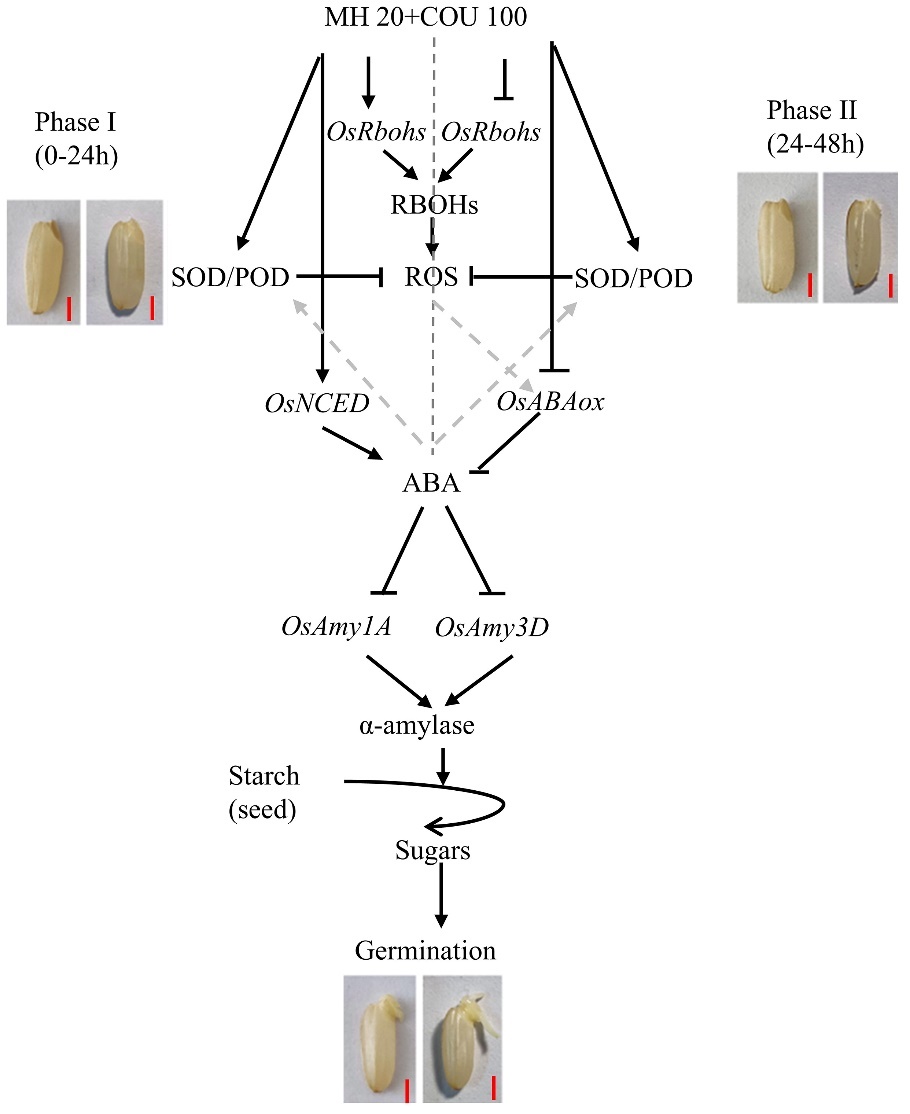 該研究首次報道了MH和COU復(fù)配對水稻種子萌發(fā)的協(xié)同抑制作用,揭示了其抑制水稻種子萌發(fā)的機制,涉及ROS積累、ABA代謝和淀粉降解等多個生理過程,并繪制了相應(yīng)的機制模型(圖3),研究成果不僅加深了對PHS抑制劑調(diào)控種子萌發(fā)機制的理解,也為MH和COU在防止穗發(fā)芽的應(yīng)用中提供了理論支持,有望在農(nóng)業(yè)生產(chǎn)中得到廣泛應(yīng)用。