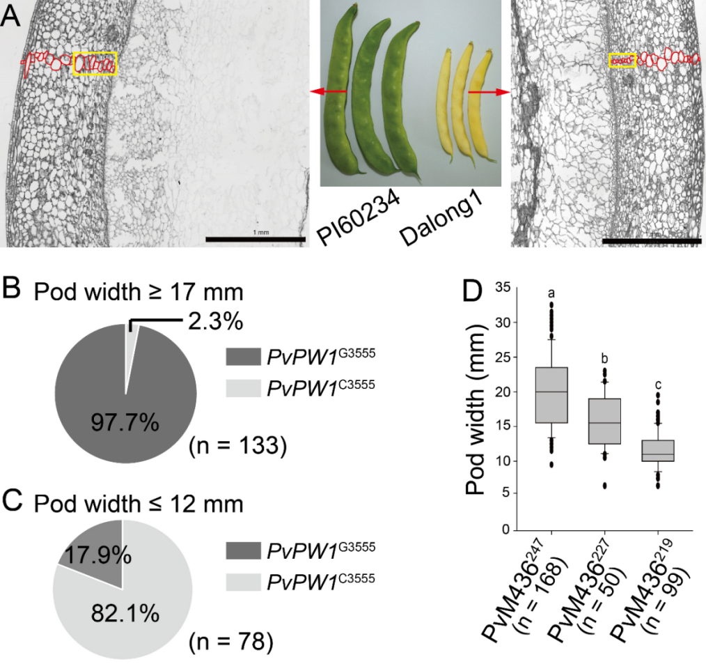 東北地理所研究團隊以窄豆莢表型的菜豆品種大龍1號(豆莢寬度12 mm)為母本、寬豆莢表型的菜豆品種PI60234(豆莢寬度21 mm)為父本(圖A),通過傳統(tǒng)的圖位克隆技術(shù),完成了PvPW1基因的精細定位,進一步利用17組雙親遺傳群體對PvPW1基因調(diào)控豆莢寬度的功能進行驗證。研究發(fā)現(xiàn),133個寬豆莢菜豆品系中97.7%為PvPW1G3555單倍型(圖B),78個窄豆莢品系中82.1%為PvPW1C3555單倍型(圖C),說明PvPW1G3555單倍型正調(diào)控菜豆豆莢寬度,且PvPW1基因已在菜豆的人工選擇育種中受到選擇。59個菜豆品種的重測序結(jié)果顯示PvPW1基因內(nèi)含子中8-bp的插入與PvPW1G3555單倍型相關(guān)聯(lián)。基于此,該研究開發(fā)了可用于分子輔助育種的InDel分子標記PvM436。對317個菜豆品系進行基因分型的結(jié)果顯示,PvM436247和PvM436227基因型個體的豆莢寬度大于PvM436219基因型個體(圖D)。該研究克隆了控制菜豆豆莢寬度的主效基因PvPW1,基于該基因的多態(tài)性開發(fā)了可用于分子輔助育種的PvM436分子標記,對于利用分子輔助手段進行菜豆豆莢形態(tài)的定向改良提供理論基礎(chǔ)和實踐指導(dǎo)。