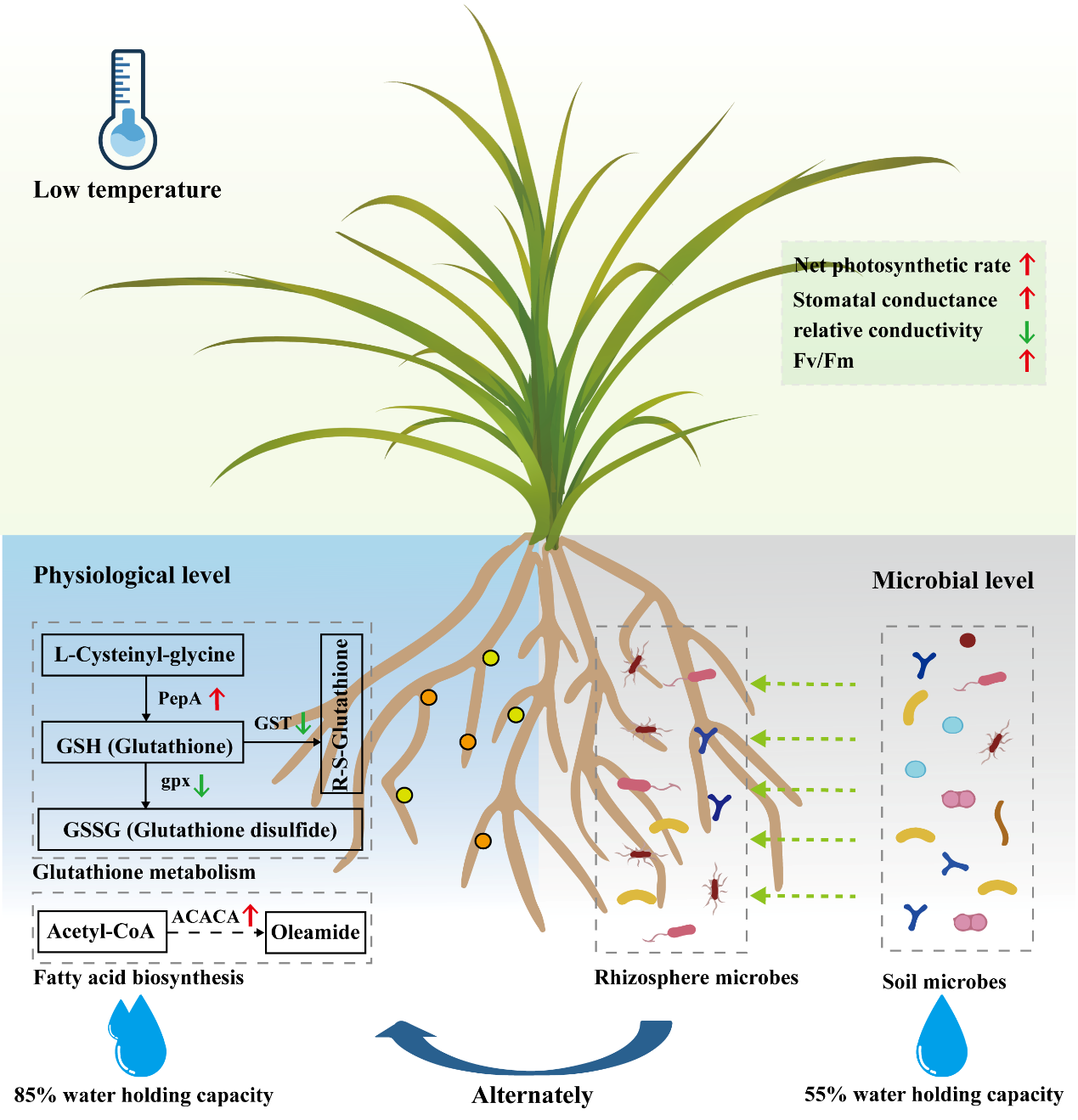 低溫導致作物植株細胞膜通透性改變、限制光合碳同化能力,對作物生產造成極大影響。根際微生物通過代謝調節(jié)、細菌細胞外多糖產生、抗氧化防御和促進根系生長等方式幫助作物應對環(huán)境脅迫。分根區(qū)干旱灌溉已被廣泛用于調節(jié)作物根系發(fā)育和緩解環(huán)境脅迫,但現(xiàn)有的研究主要關注干旱和鹽脅迫下作物的生理機制,對灌溉誘導的根系代謝和根際微生物組的改變如何促進低溫抗性的見解有限。