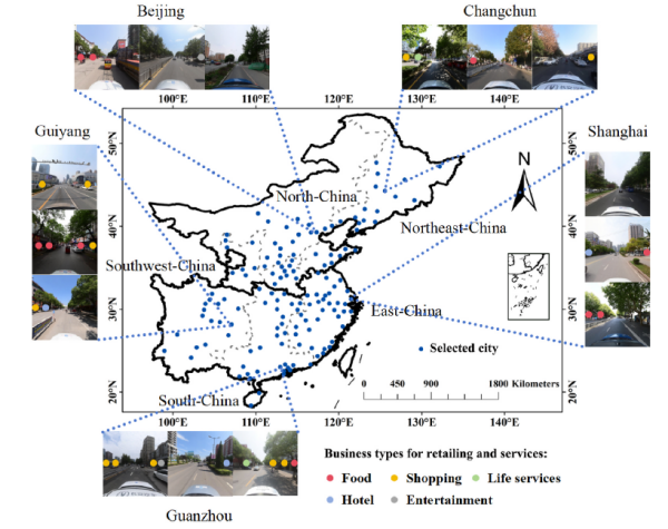 在城市商業(yè)街區(qū)森林生態(tài)基礎(chǔ)設(shè)施服務(wù)功能方面,研究團(tuán)隊(duì)選取了中國148個(gè)城市的1152萬條興趣點(diǎn)數(shù)據(jù),涵蓋食品、購物、生活服務(wù)、酒店和娛樂等五大零售行業(yè),并結(jié)合129萬張街景圖像計(jì)算的綠視率,分析了不同氣候區(qū)和道路等級下零售店鋪數(shù)量與行道樹覆蓋率之間的關(guān)系。研究發(fā)現(xiàn),亞熱帶氣候區(qū)的城市零售店鋪數(shù)量普遍高于溫帶氣候區(qū),并通過深度學(xué)習(xí)模型對2024年的零售店鋪分布進(jìn)行城市商業(yè)空間布局的優(yōu)化建議(圖2)。