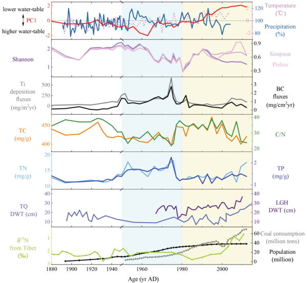 東北地理所濕地演化與生態(tài)功能學(xué)科組以大興安嶺北部宏圖(HT)泥炭地為研究對(duì)象,闡明過去150年來泥炭地硅藻組合特征和多樣性;基于硅藻重建歷史時(shí)期泥炭地水位變化,并結(jié)合地球化學(xué)代用指標(biāo),探討人類活動(dòng)和氣候變化對(duì)泥炭地水文環(huán)境演變過程的影響。研究結(jié)果表明:1950年以前宏圖泥炭地水文環(huán)境演變主要受氣候影響,由于當(dāng)?shù)鼐用褚葬鳙C和采集活動(dòng)為主,泥炭地保持著原始狀態(tài)。1949年新中國成立后,由于人口快速增長、采礦業(yè)和工業(yè)等因素導(dǎo)致火災(zāi)頻發(fā),硅藻多樣性遭到破壞。1980年特別是2000年以后,耐高氮型硅藻種類(Achnanthidium minutissimum和Craticula molestiformis)的突然增加表明人類活動(dòng)引起的氮沉降效應(yīng)增強(qiáng)。20世紀(jì)80年代以來,煤炭燃燒、工業(yè)化、城市化和人口指數(shù)增長對(duì)大興安嶺地區(qū)泥炭地水文環(huán)境演化具有重要影響。工業(yè)生產(chǎn)和煤炭消耗造成的人為源排放增加了大氣氮沉降,宏圖泥炭地的水文環(huán)境不穩(wěn)定(干旱和氮沉降增加)是由全球變暖和人為大氣排放共同造成的。人類活動(dòng)對(duì)泥炭地的強(qiáng)烈影響在泥炭沉積物中留下了人類世的顯著地層學(xué)信號(hào)。