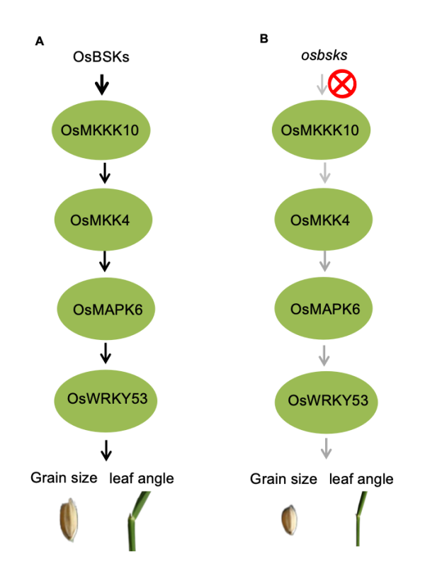 圖1. OsBSKs-OsMKKK10-OsMKK4-OsMAPK6-OsWRKY53調(diào)控水稻粒型和葉角的模式圖